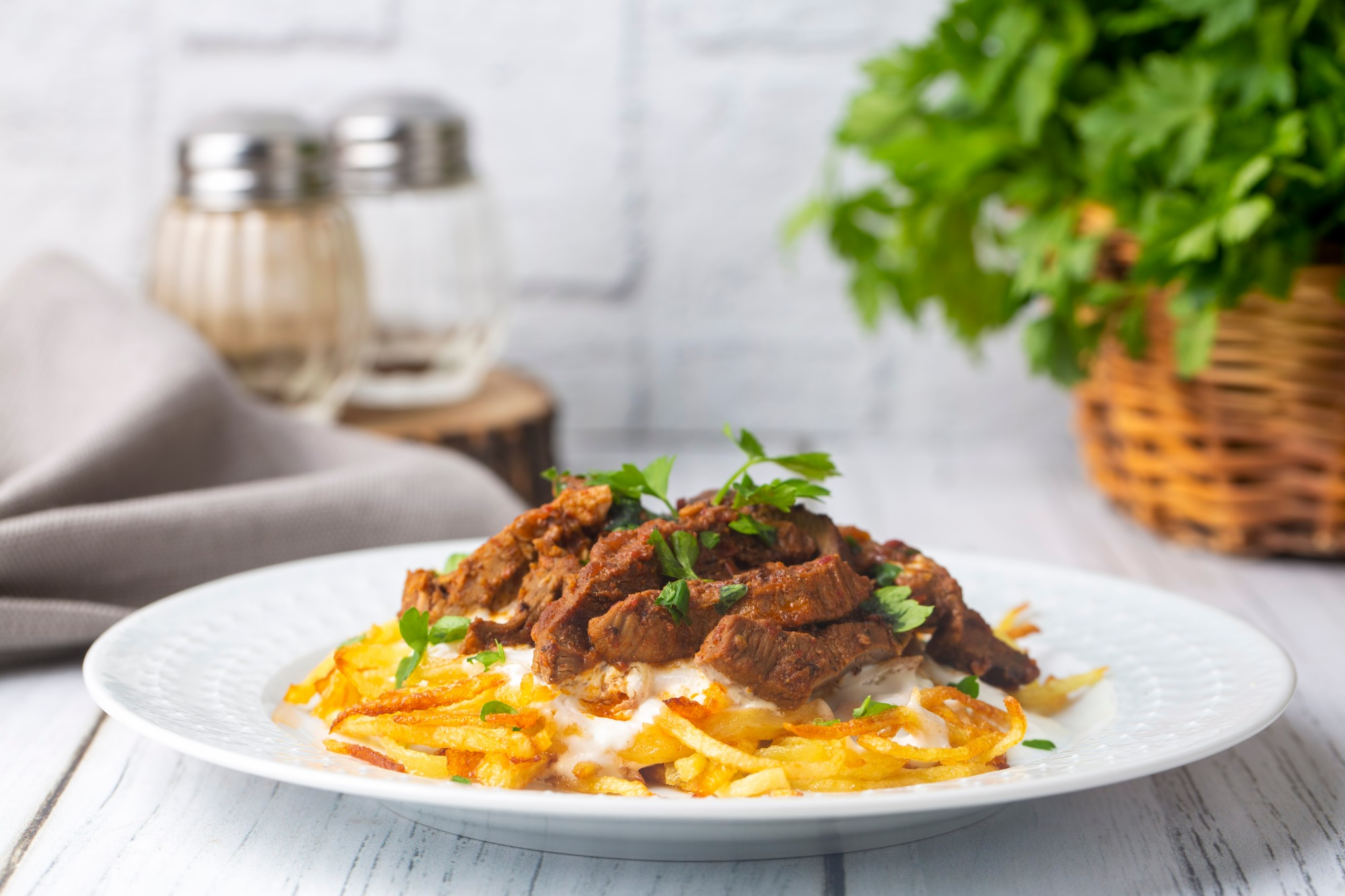 mięso, sos, frytki