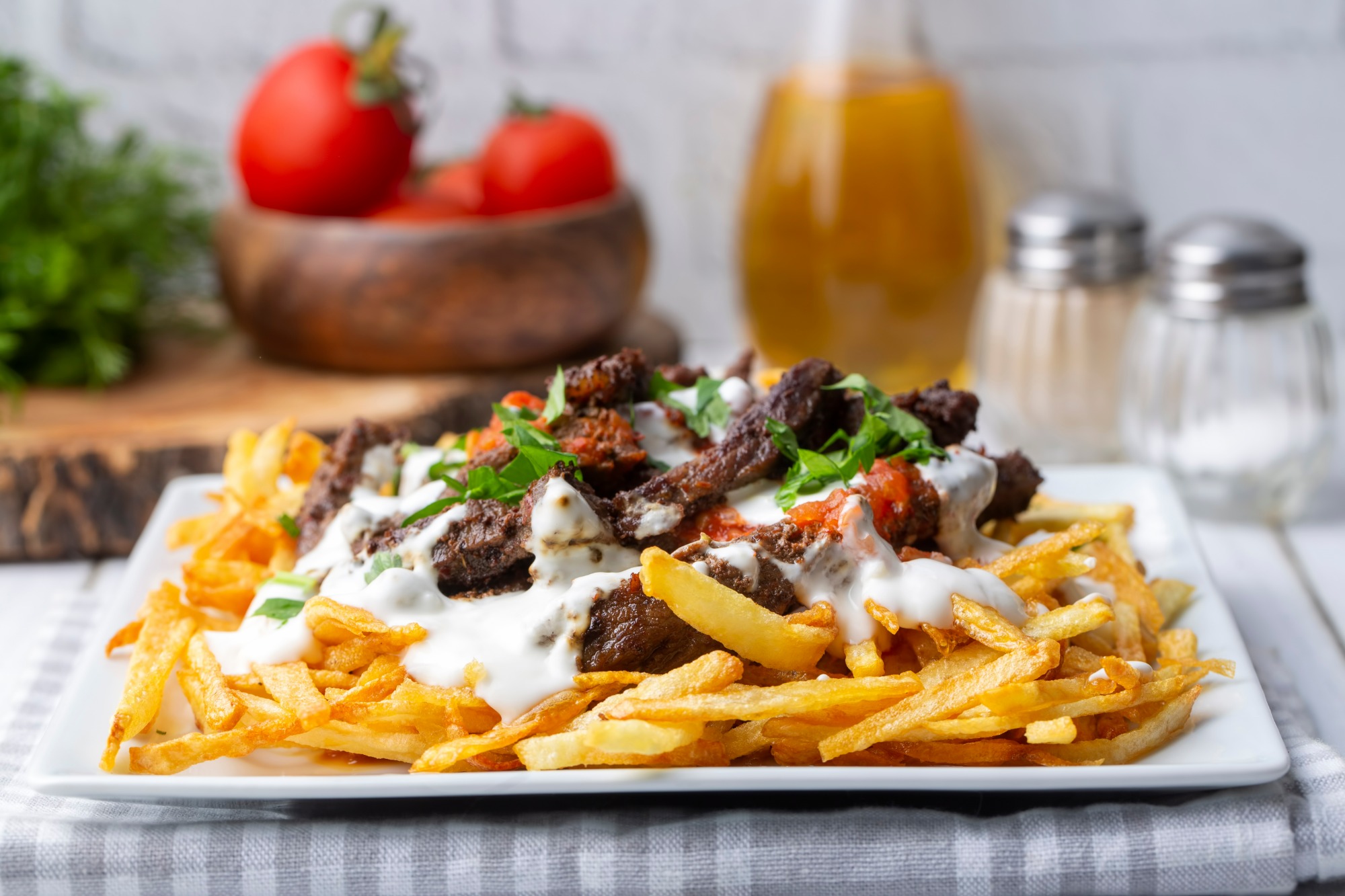 mięso, sos, frytki, ser -